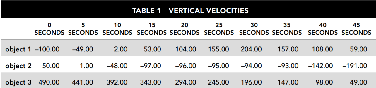 Table 1 indicates the vertical velocities of the three different objects as measured every 5 seconds. Positive velocities indicate motion upward, and negative velocities indicate motion downward.